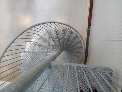 Deze thermisch verzinkte spiltrap met eindbordes is voorzien van geperforeerde stalen traptreden en bordesdelen.